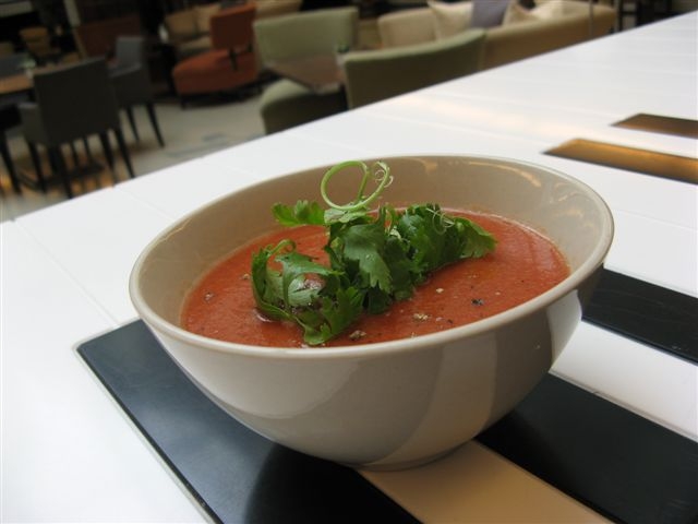 Polévku gazpacho podáváme studenou, dobře vychlazenou, posypanou chlebovými krutony a nakrájenými paprikami a salátovou okurkou, nebo i jinou zeleninou.