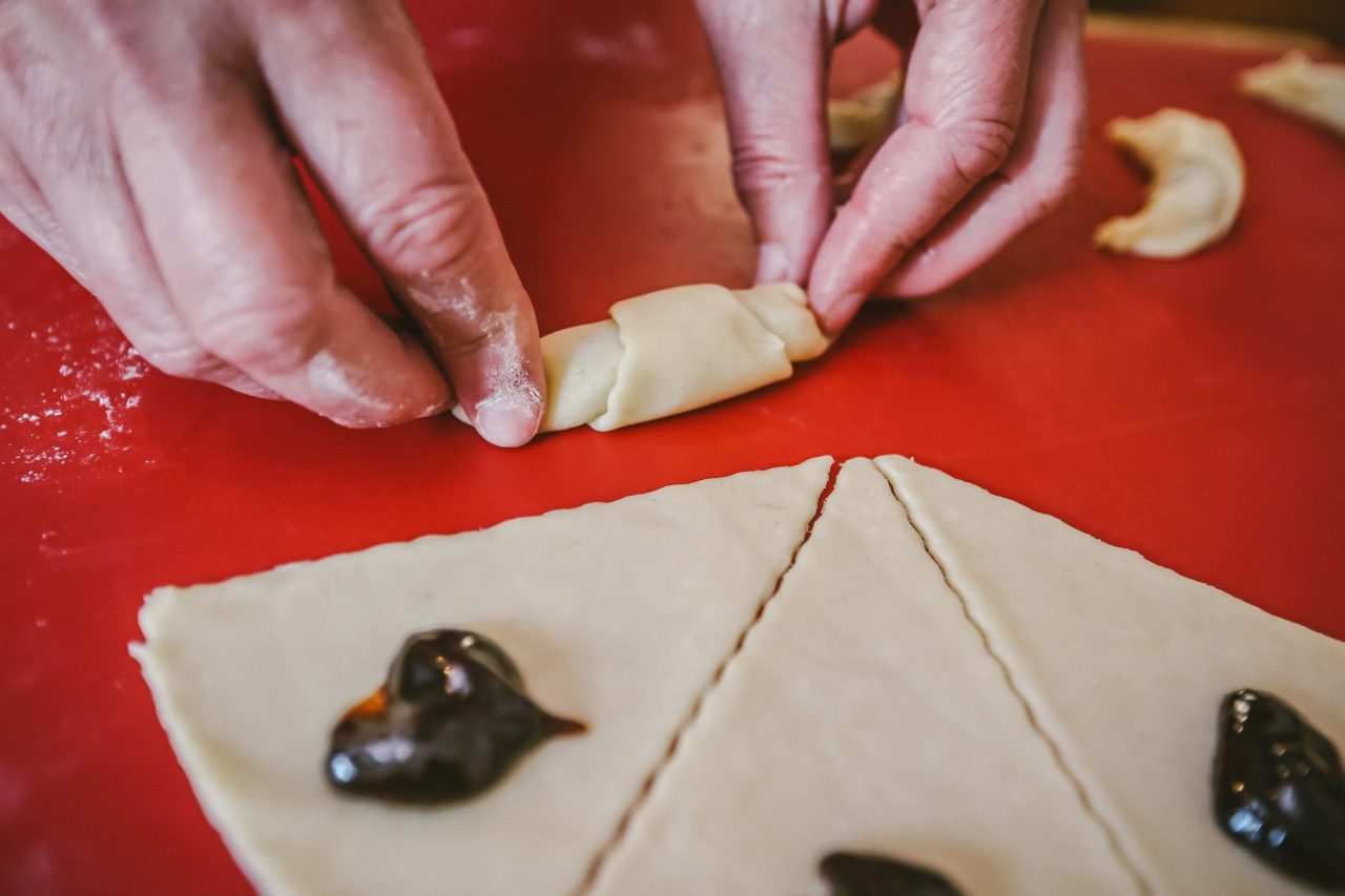 Každou placku rozkrájíme na výseče – na osm dílů jako dort. Na vnější kraj každé výseče položíme vrchovatou čajovou lžičku povidel. Smotáme od širšího kraje směrem do středu, ke špičce. Vznikne rohlíček, který ohneme do obloučku a jeho špičky zamáčkneme rukou, aby náplň při pečení nevytekla.