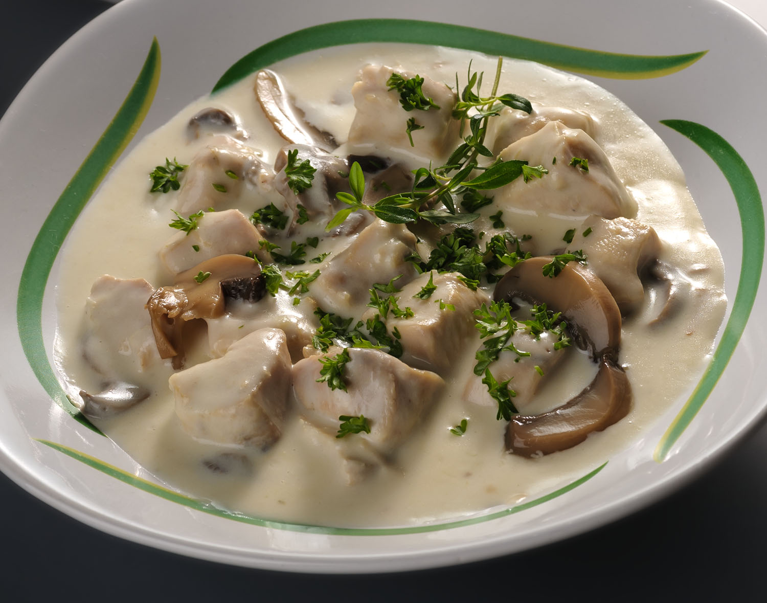 Na pánvi rozehřejeme olej a připravené maso v něm za stálého míchání opečeme. Asi po pěti minutách přidáme na plátky nakrájené sterilované žampióny a společně podusíme asi pět minut. Pak odstraníme koření, vše zalijeme šlehačkou a velmi krátce, asi dvě minuty, povaříme.