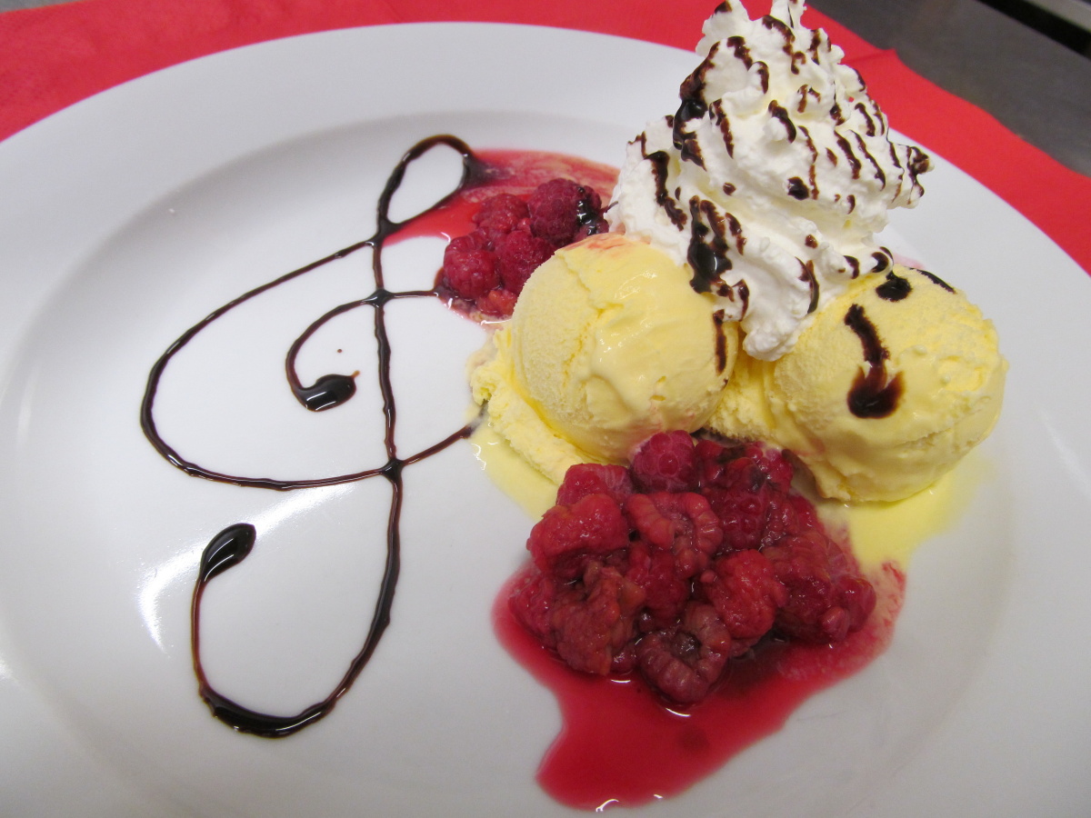 Do pohárů rozdělíme zmrzlinu a pokryjeme ji malinovým krémem. Ozdobíme čerstvými malinami a lístky máty nebo meduňky.