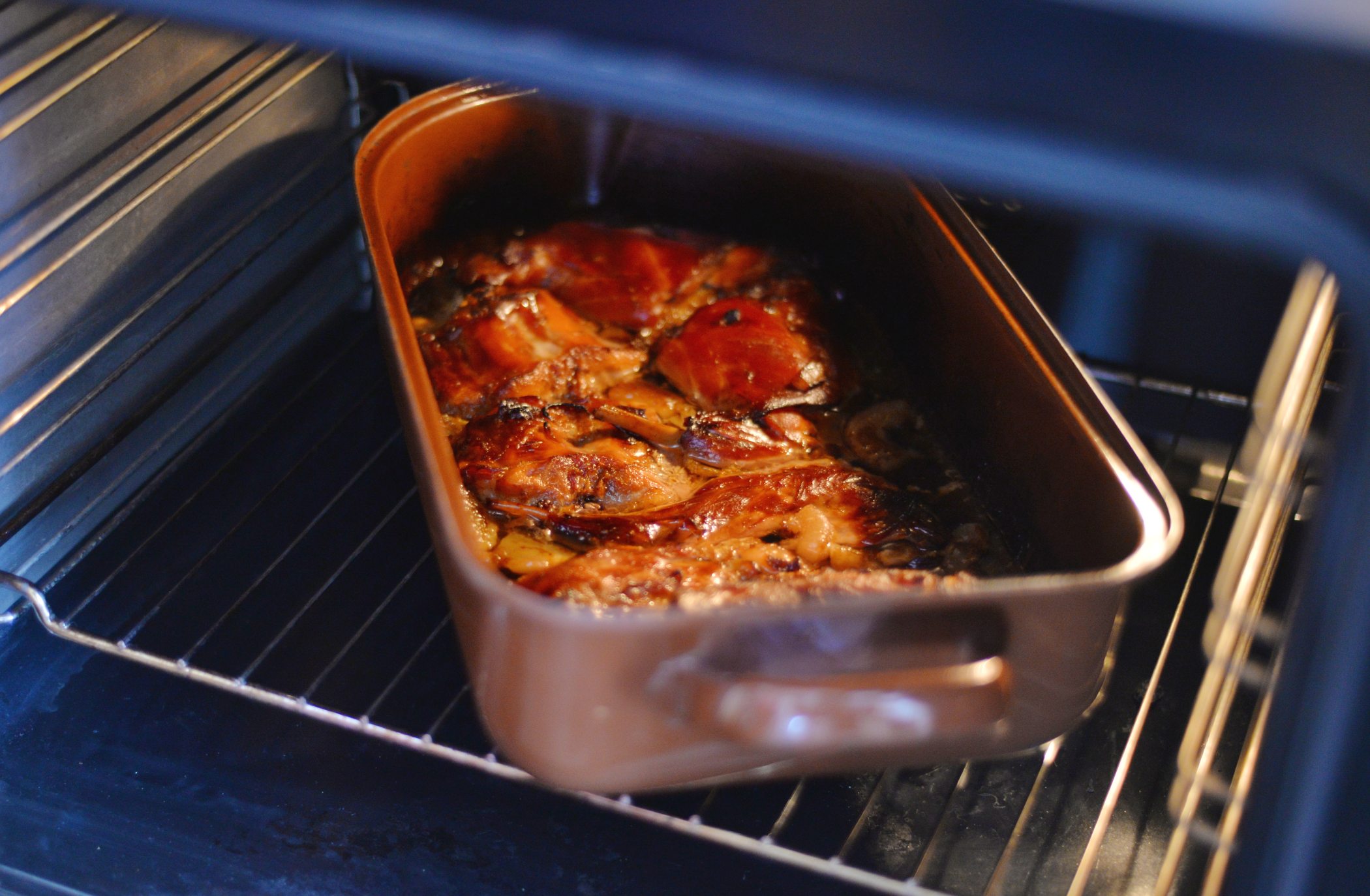 Po uplynutí této doby vložíme pekáč s králíkem a marinádou do vyhřáté trouby a pečeme při 160 °C asi 1–1,5 hodiny do zlatočerveného zabarvení. Během pečení maso obracíme a poléváme vypečenou šťávou.