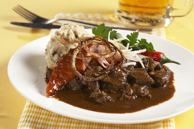 Porce guláše zdobíme plátky čerstvé zeleniny, kolečky cibule nebo pórku apod.