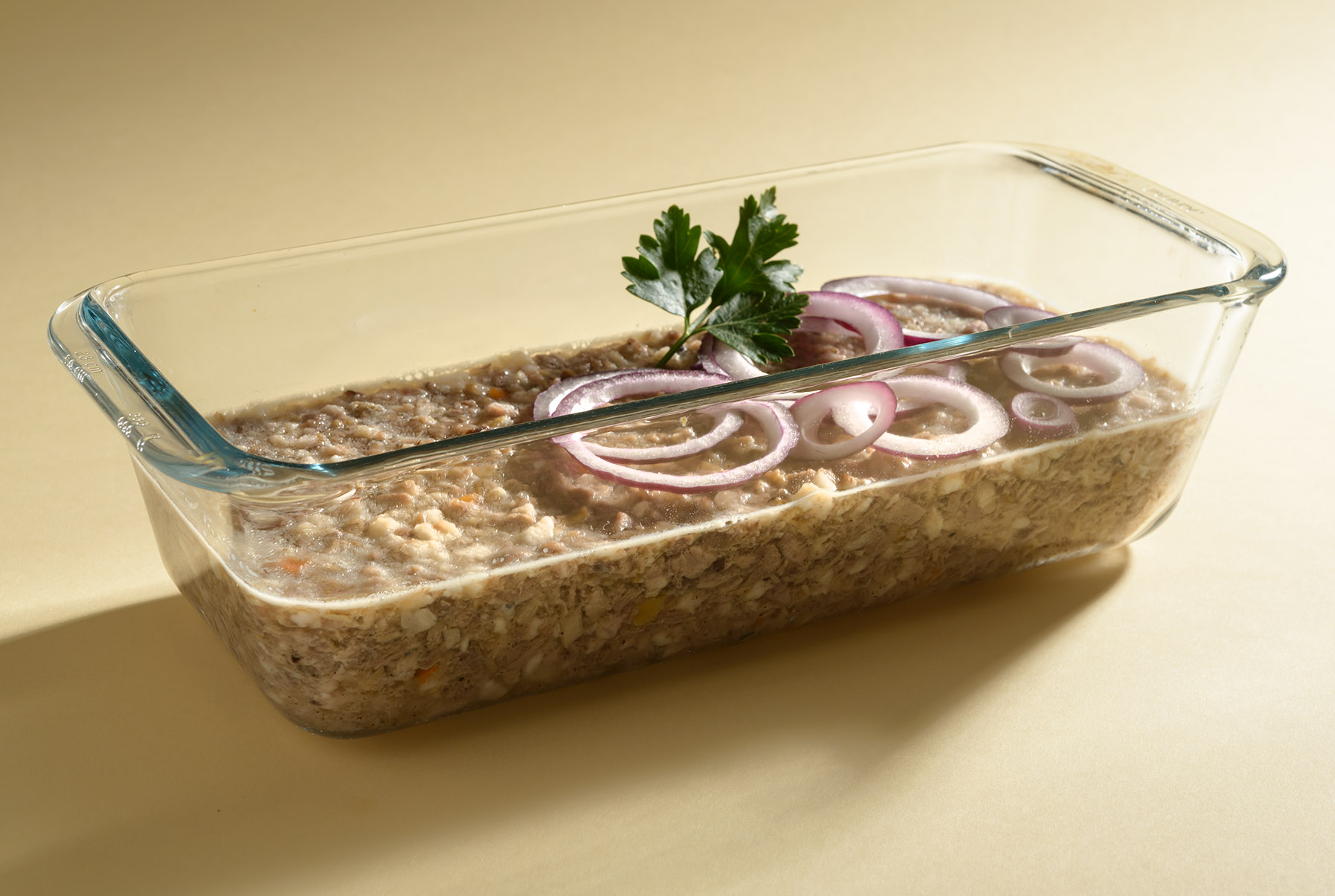 Maso vykostíme a spolu se zeleninou nakrájíme na drobné kostičky. Vložíme do skleněné mísy nebo tvořítka a zalijeme scezeným vývarem, z jehož povrchu jsme odstranili tuk. V chladu necháme ztuhnout.