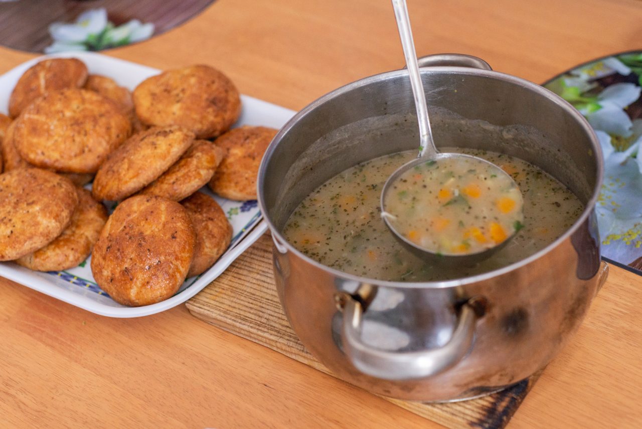 Před samotným pečením jsme byli pozvání na výbornou domácí bramboračku se škvarkovými plackami. Byla to náramná dobrota.