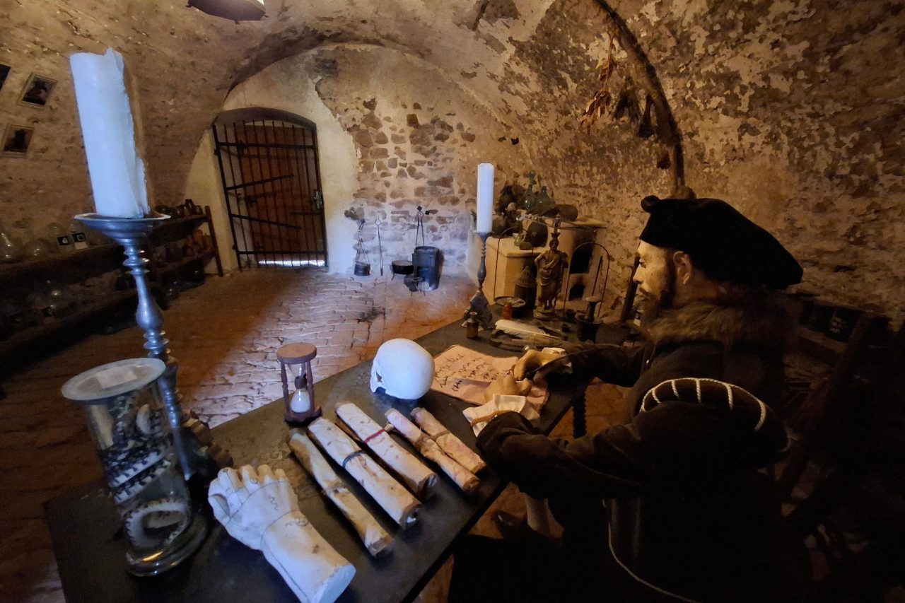 Ladislav Velen ze Žerotína pozval na zámek také italského astrologa a alchymistu Marca Eugenia Bonacinu, který se stal zároveň jeho dvorním lékařem. Druhý návštěvnický okruh vás proto zavede do alchymistické laboratoře Mistra Bonaciny, která je umístěná v nejstarším křídle zámku.