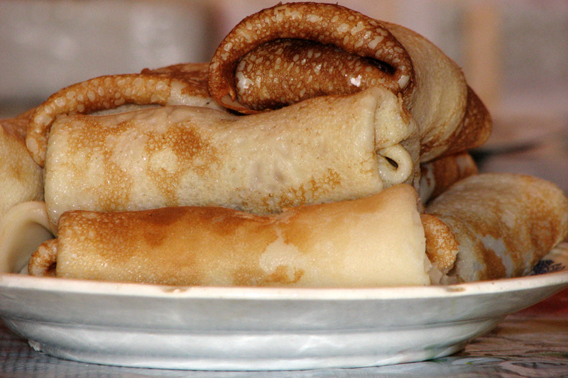 Z odleženého těsta smažíme na oleji tenké palačinky. Po upečení je potřeme ochuceným tvarohem, zavineme, naskládáme do máslem vymazaného a strouhankou vysypaného pekáče nebo zapékací mísy a pečeme v troubě při 160° C 5 minut.
